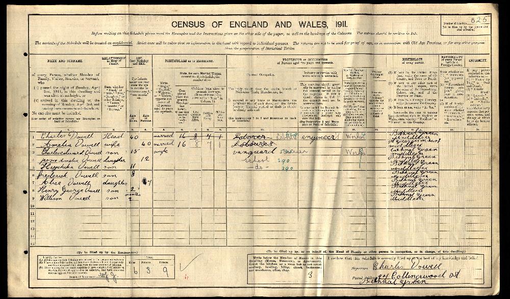 The household consisted of Charles, his wife Amelia and their grown up children Charles, Henry, William and Alice. From Henry's date of birth shown in the register (2 March 1900) it is thought that he is actually Hezekiah Dowell. Although Charles (Jnr) is shown as married his wife is not recorded as a member of the household.
