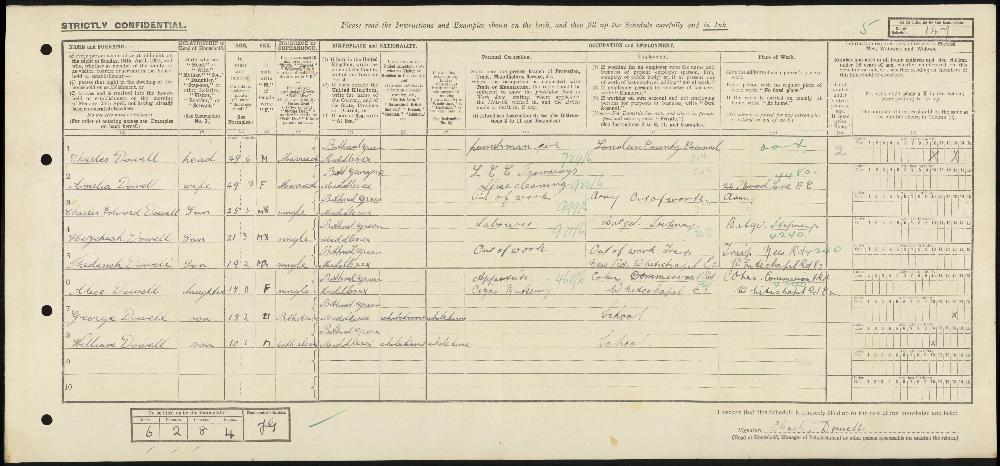 1921, 1921 Census for Household of Charles Dowell in Bethnal Green, London