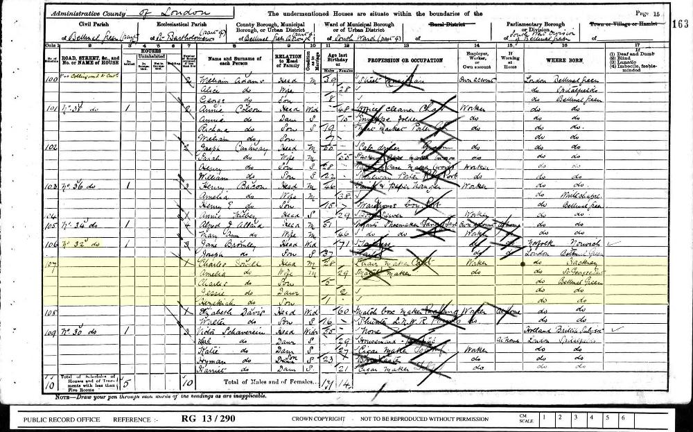 1901 England Census for Household of Charles Dowell in Bethnal Green, (Ancestry website). Custom Id: RG13/290, Folio , Page 15, Schedule 107; Cit. Date: 31 March 1901. National Archives. Call Number: 1901 Census.