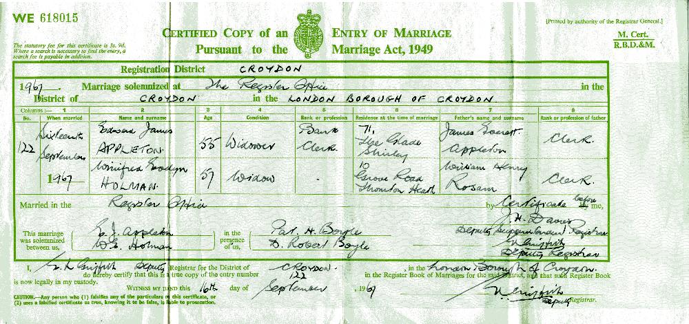 G L. Griffiths, Deputy Registrar, Croydon Regiter Office, Certified Copy of an Entry of Marriage for Edward James Appleton and Winifred Evelyn Holman, (Original certfied copy of entry number 122 issued on 16 Sep 1967). Custom Id: WE 618015; Cit. Date: 16 September 1967. Pat Ward.