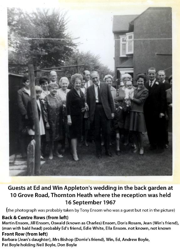 Don Boyle was the bride's nephew and Pat was his wife. The reception was held at 10 Grove Road, Thornton Heath, which was owned by the bride's sister Doris Rosam. The reception was attended by Win's sisters Dorie, Edie and Ella, Ella's husband Oswald (Charles) Ensom and their son Martin, Tony Ensom and his wife Jill , Barbara Goodman who was a great friend of Win, Eva Bishop who was a great friend of Dorie, Don and Pat Boyle and their children Andrew and Neil and several of Ed's friends.