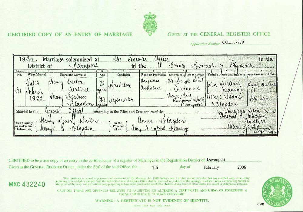 General Register Office, Civil Registration Index (England & Wales) for Marriage of Wallace, Harry V and Blagdon, Mary B, (FreeBMD and FindMyPast websites). Custom Id: Marriages 1935 Devonport Vol. 5b, Page 585; Cit. Date: Q1 1935. General Register Office.