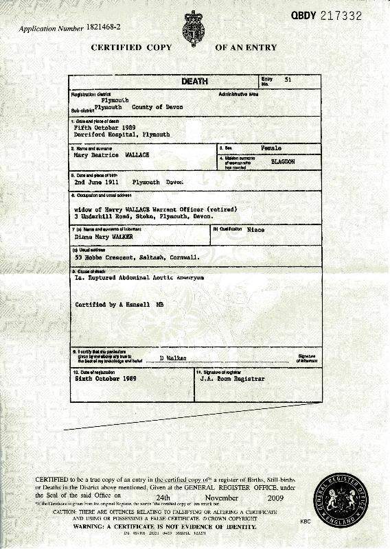 General Register Office, Certified Copy for an Entry of Death for Mary Beatrice Wallace, (24 November 1989 by General Register Office in response to Application Mo. 1821468-2). Custom Id: OBDY 217332; Cit. Date: 5 October 1989. Pat Ward.