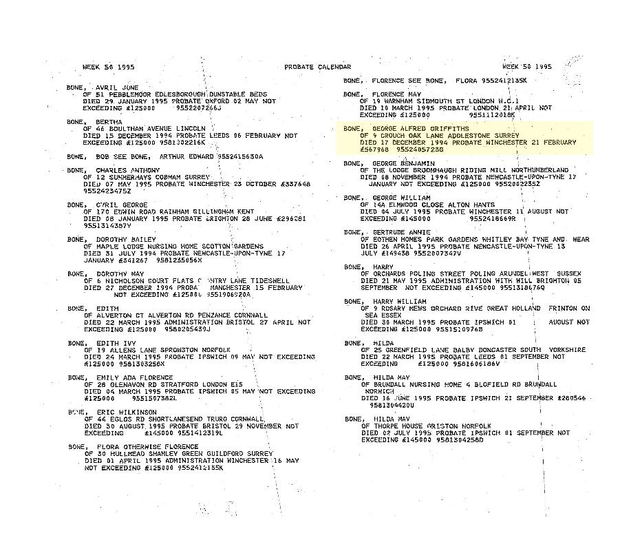 Grant of Probate: George Alfred Griffiths Bone, 21 February 1995, Principal Probate Registry, Week 50.
