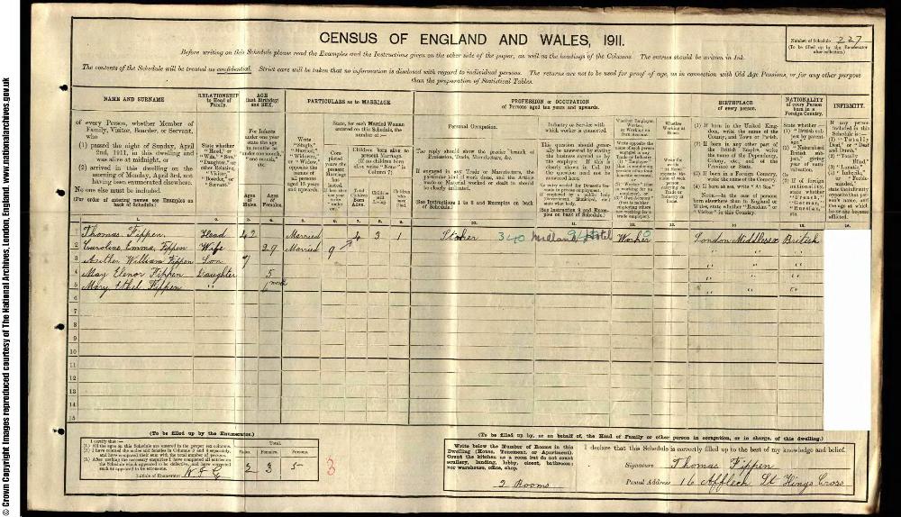 1911 England Census for Household of Thomas Fippen in Holborn, London, (FMP website). Custom Id: RG14/1221; Cit. Date: 2 April 1911. National Archives. Call Number: RG14/1221.