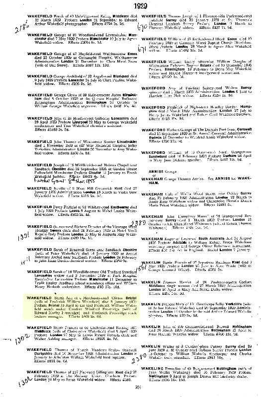 Grant of Probate: Sarah Ann Wakefield, 15 April 1929, Principal Probate Registry, 1929 Volume W Page 224.