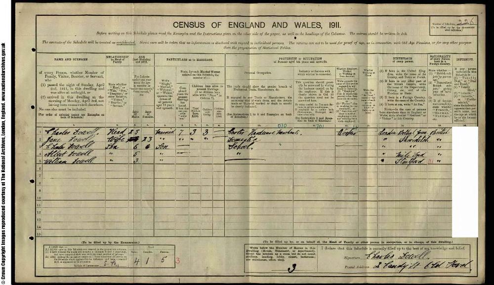 The household consisted of Charles, his wife Jane, and their children Charles (age 6), Albert (age 5) and William (age3). The family had the house to themselves but the houses in Candy Street were quite small with 3 or 4 rooms each. Charles and Albert were attending the local school.