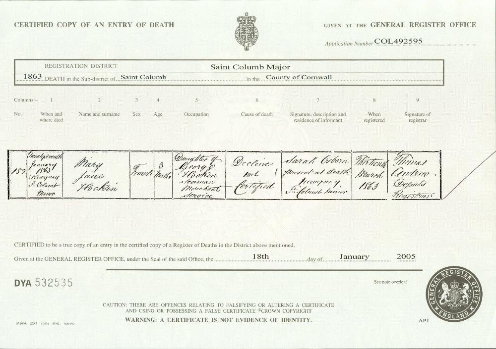 General Register Office, Certified Copy of an Entry of Death for Sarah Jane Hockin, (By General Register Office on 18 Jan 2005 in response to Application COL492595). Custom Id: DYA 532535; Date Registered. Cit. Date: 13 March 1863. Pat Ward.