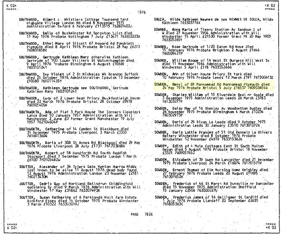 England and Wales Death Registration Index, Beryl Sowden, Q2 1976, Plymouth, Vol. 21, Page 1979, General Register Office.