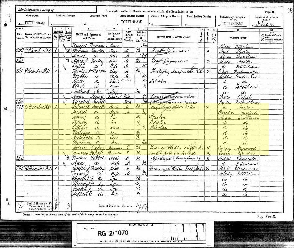The household consisted of Frederick; his wife Harriet; their children Henry (age 11), Sidney (age 9), Lillian (age 8), William (age 4), Archibald (age 3), and Beatrice (6 months); and two lodgers John Daley and James Hodges. The houses in Circular Road appear to have either 6 or 7 rooms. As two of the rooms at No. 9 were occupied by another family and the two boarders almost certainly shared a room Frederick’s family must have been crammed into 3 or 4 rooms. The three eldest children are attending school.