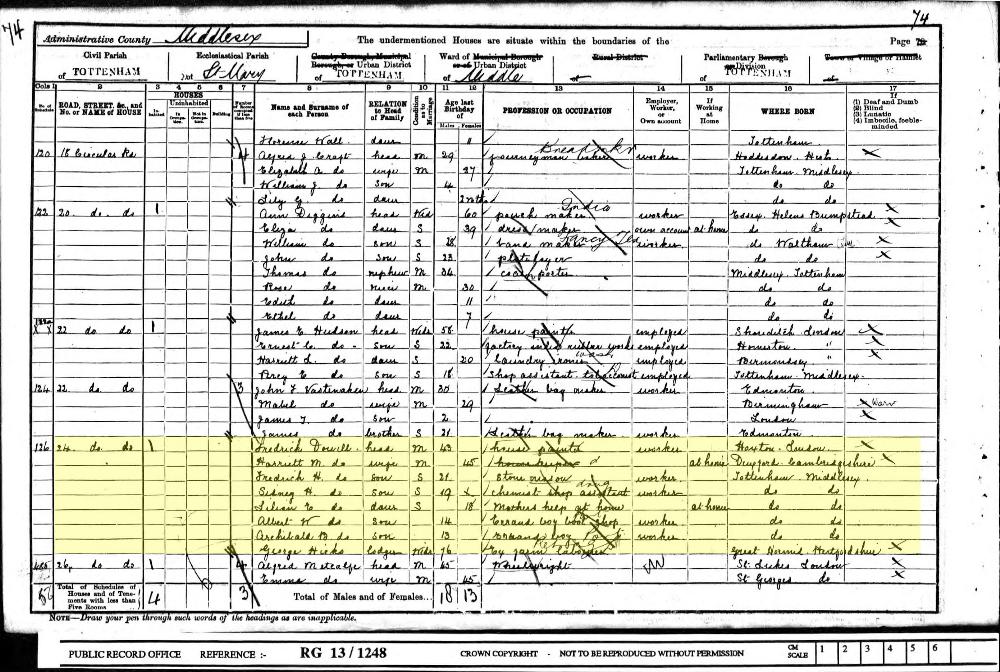 1891 England Census for Household of Frederick Dowell in Tottenham, Middlesex, (Ancestry website). Custom Id: RG13/1248 Folio 70 Page 74; Cit. Date: 31 March 1901. National Archives.