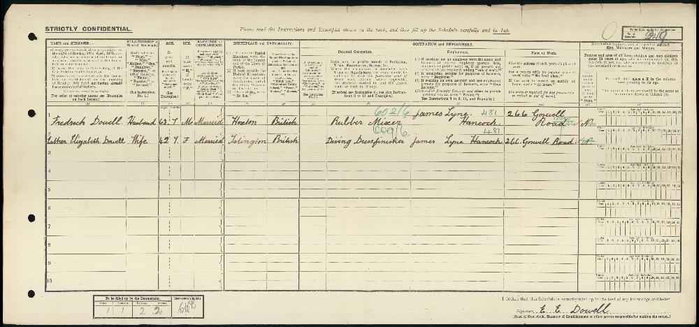 1921 England, Wales & Scotland census, 66 Bruce Castle Road, Tottenham, Middlesex, head of household: Frederick Dowell, National Archives.