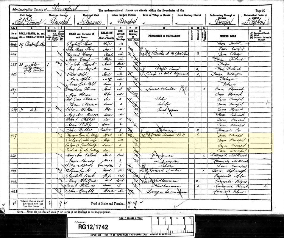 No trace of Thomas, Evelyn or their children Evelyn and Beatrice could be found in the 1901 Census although all were known to be alive at the time. As they were shown living in Pembroke Street, Devonport in the 1891 and 1911 Censuses it is possible that they were living in Pembroke Street at the time of the Census but were missed.