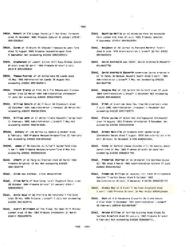 Grant of Probate: Gladys May Isaac, 29 May 1985, Bristol Probate Registry, 1985 Page 4454.