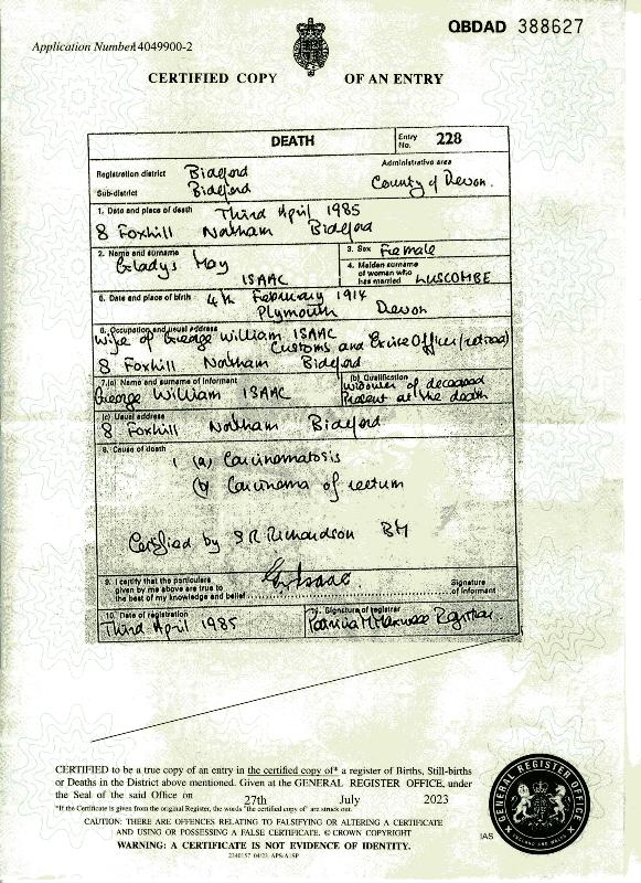England and Wales Death Registration Index, Gladys May Isaac, April 1985, Bideford, Vol. 21, Page 873, General Register Office.