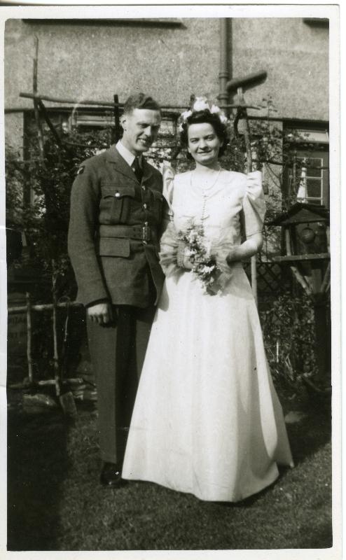 The groom was an Airman in the RAF and presumably has been called up or had volunteered for wartime service. The bride was wearing a white wedding dress. To provide one in wartime was quite difficult because of clothes rationing but it is thought that brides to be were issued with additional clothing coupons. However, a more probable explanation is that she adapted an existing dress or borrowed one from a friend or relative.The date is based on their marriage registration in the second quarter of 1940 and the summery weather depicted in the wedding photographs. The guest list was determined from a photograph taken at the wedding breakfast which was held at the bride's parents house at 10 Grove Road, Thornton Heath, Surrey. Why none of the groom's relatives were present is not known. Perhaps because it was wartime they were unable to travel or perhaps they were there and were photographed with the couple separately but the photograph has not survived in Pat Ward's archive.