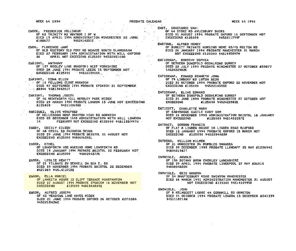 Grant of Probate: Ella Muriel Ensom, 16 November 1994, Principal Probate Registry, Week 44.