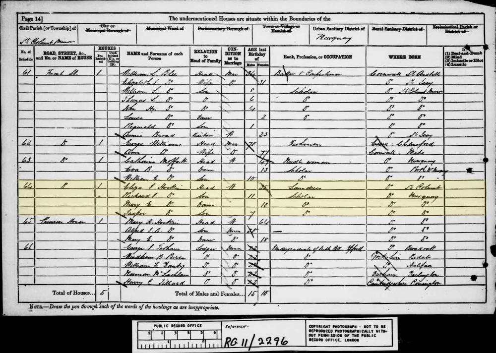 1881 England, Wales & Scotland census, Front Street, St Columb Minor, Cornwall, head of household: Eliza J Hockin, National Archives.