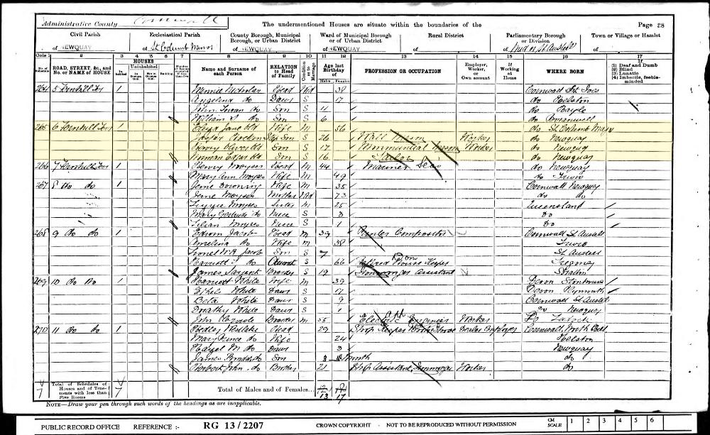 1901 England, Wales & Scotland census, 6 Townhill Terrace, Newquay, Cornwall, RG13/2207, Folio 54, Page 38, Schedule 265, head of household: Eliza Jane Old, National Archives.