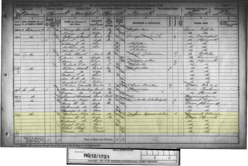 1881 England Census for Household of Richard Sleep in Stoke Damerel, Devon, Census Type: 1881 England, Census Place: Stoke Damerel, Folio: 56, Page: 30. National Archives. Call Number: RG11/2208.