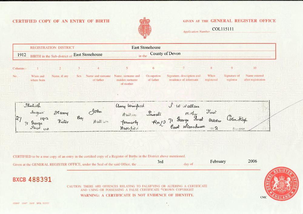 General Register Office, Certified Copy of an Entry of Birth for Harry Victor Wallace, (3 Feb 2006 in response to Application No COL115111). Custom Id: BVCB488391; Cit. Date: 1 October 1912. Pat Ward.