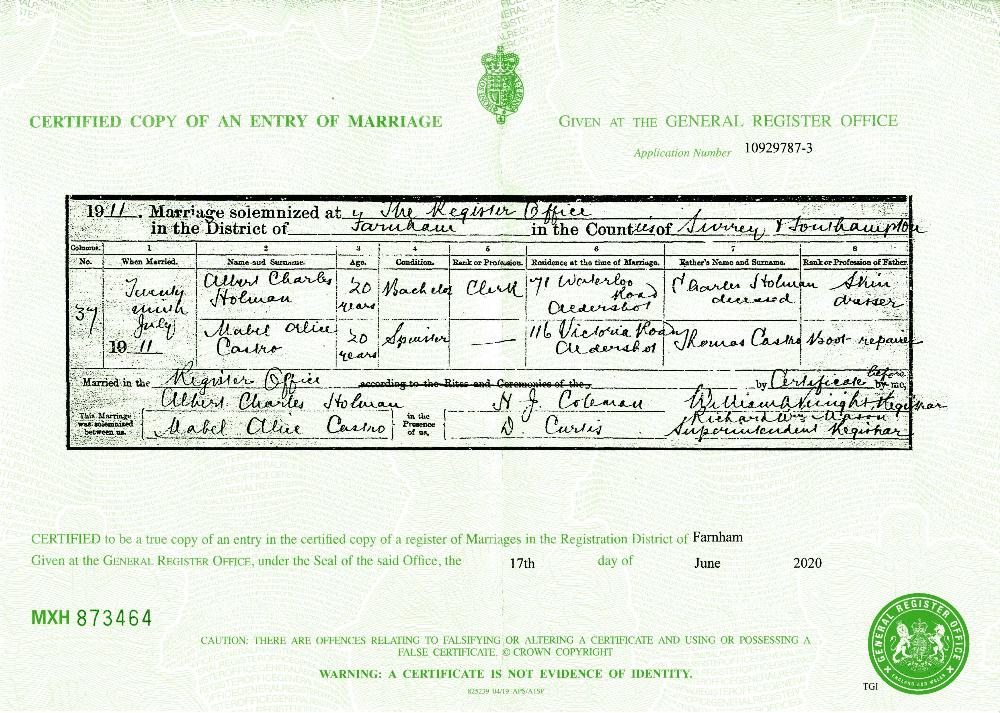 General Register Office, Certified Copy of an Entry of Marriage for Albert Charles Holman and Mabel Alice Castro, (Certified Copy of an Entry of Marriage in the District of Fareham issued by General Register Office on 17 Jun 2020 in response to Application No 10929787-3). Custom Id: MXH 873464; Cit. Date: 29 July 1911. Pat Ward.
