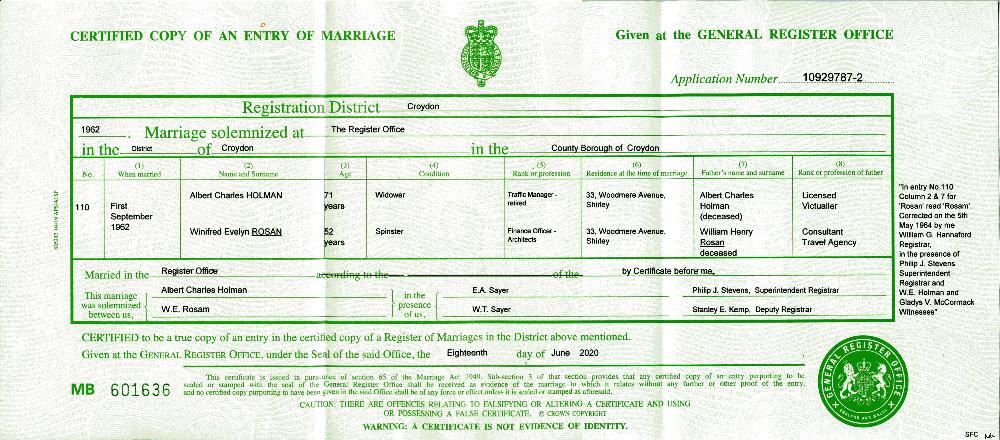 Philip J. Stevens, Superintendent Registrar Croydon Register Office, Certified Copy of an Entry of Marriage for Albert Charles Holman and Winifred Evelyn Rosam, (Issued byGeneral Register Office on 18 Jun 2020 in response to Application No 10929787-2). Custom Id: MB 601636; Cit. Date: 1 September 1962. Pat Ward.