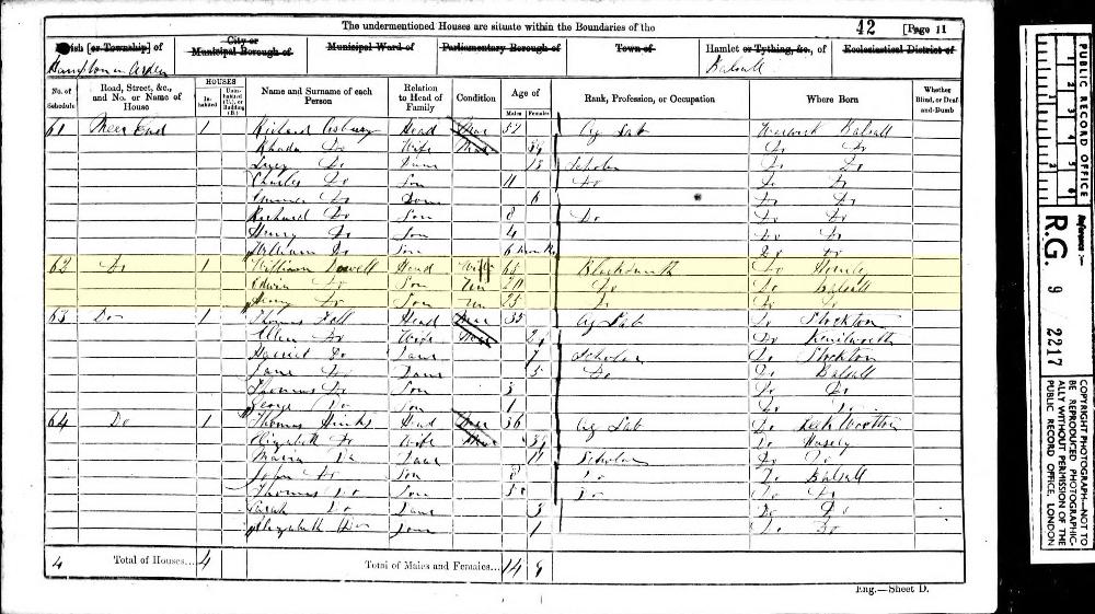 1861 England, Wales & Scotland census, Hamlet of Basall, Hampton in Arden, Warwickshire, RG9/2217, Folio 42, Page 11, Schedule 62, head of household: William Dowell, National Archives.