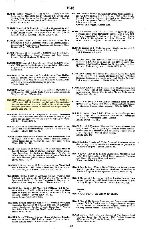 Grant of Administration: Edward Albert Blagdon, 12 June 1943, Principal Probate Registry, 441.