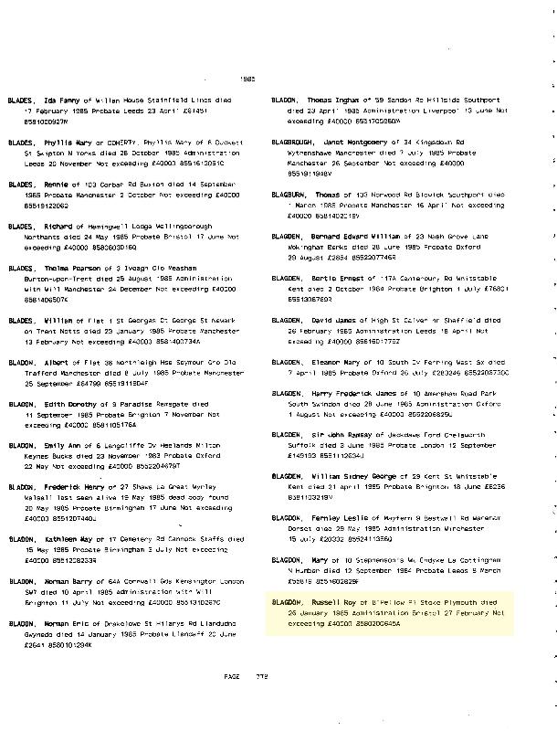 Grant of Administration: Russell Roy Blagdon, 27 February 1985, Principal Probate Registry, 1985 Baacke to Bzowy Page 778.
