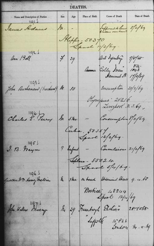 Registrar General of Shipping and Seamen , Death Registration for James Adams, (FMP website). He was serving in the S.S. Alippo at the time of his death in February 1869. Registrar General of Shipping and Seamen.