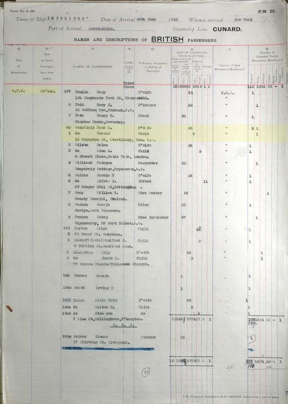 Passenger List: Maud R Wakefield, June 1920, Board of Trade.