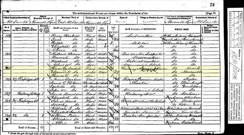 1871 United Kingdom census, 26 Trafalgar Street, Newcastle-on-Tyne, Northumberland, RG10/5096, Folio 29, Page 21, Schedule 125, head of household: Thomas Lauderdale, National Archives.