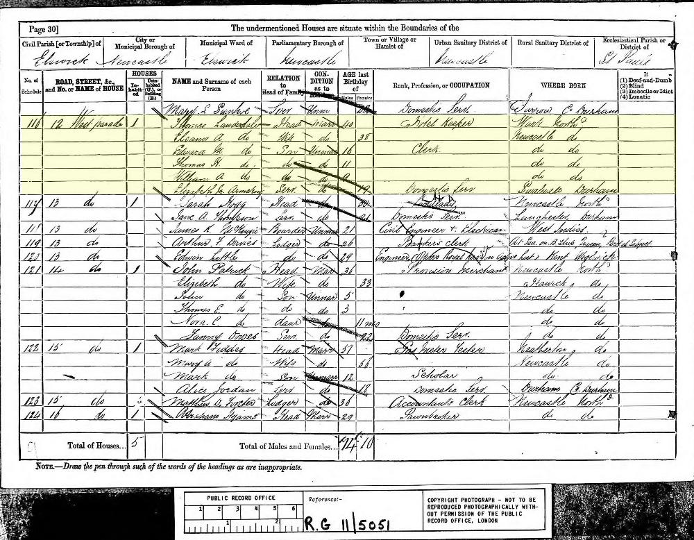 1881 United Kingdom census, 12 West Parade, Newcastle-on-Tyne, Northumberland, RG11/5051. Folio 45, Page 30, Schedule 116, head of household: Thomas Lauderdale, National Archives.