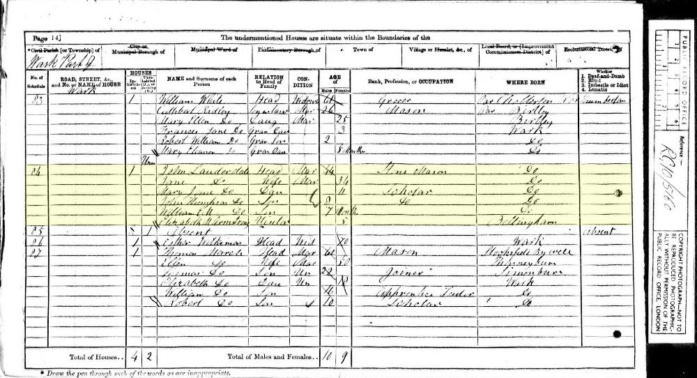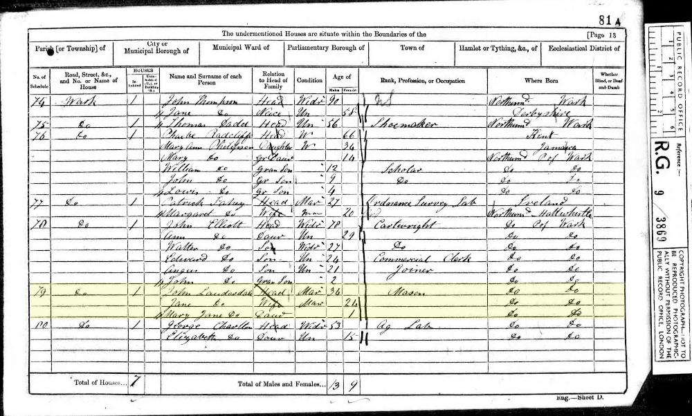 1861 United Kingdom census, Wark, Wark, Northumberland, RG9/3869, Folio 81A, Page 13, Schedule 79, head of household: John Lauderdale, National Archives.