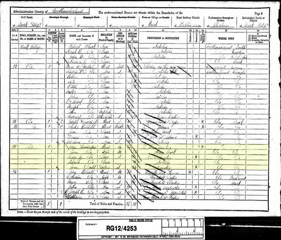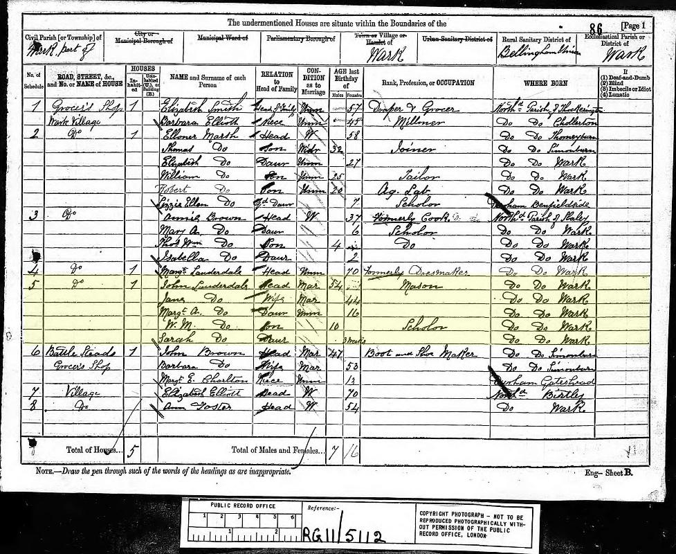 1881 United Kingdom census, Wark Village, Wark, Northumberland, RG11/5112, Folio 86, Page1, Schedule 5, head of household: John Lauderdale, National Archives.