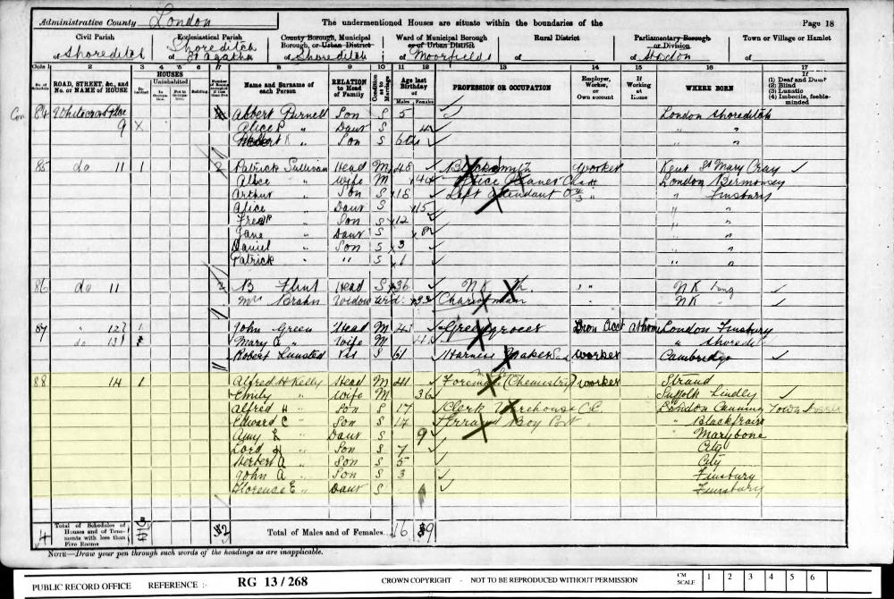 Ibid. Emily Kelly, wife of Alfred H. Kelly, age 36 born in Lindly, SuffolkAlfred H. Kelly son age 17. National Archives. Call Number: RG13/268.