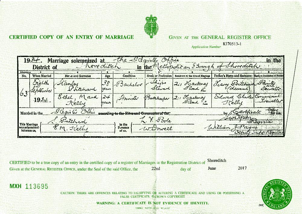 General Register Office, Certified Copy of an Entry of Marriage for Stanley Pritchard and Ethel Maud Kelly, (Issued by General Register Office on 22 June 2017 in response to Application No. 8370513-1). Custom Id: MXH 113695; Groom's occupation. Cit. Date: 8 September 1934. Jack Ward, The Nook, Silver Street