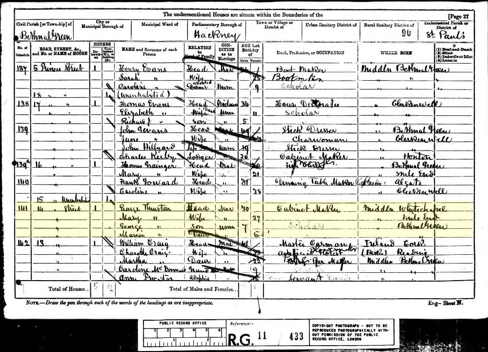 1881 England, Wales & Scotland census, 14 Princes Street, Bethnal Green, London, RG11/433, Folio 90, Page 27, Schedule 141, head of household: George Thurston, National Archives.