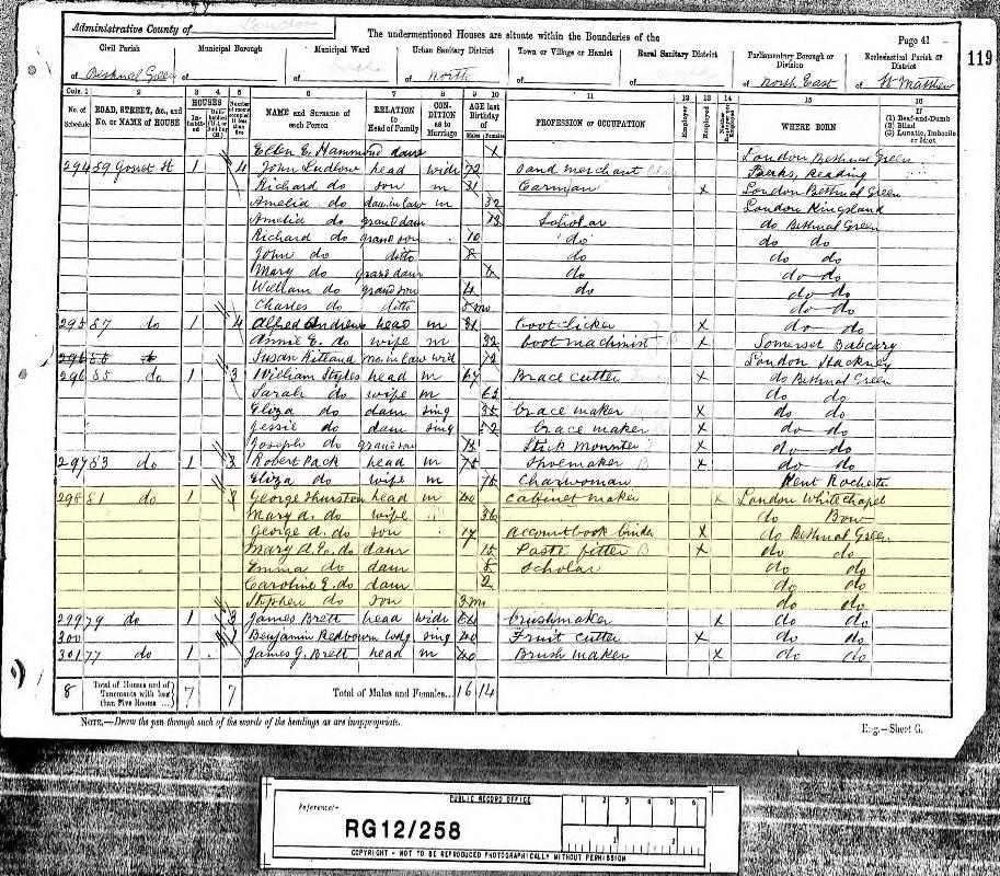 1891 England, Wales & Scotland census, 81 Gosset Street, Bethnal Green, London, RG12/258, Folio 119, Page 41, Schedule 298, head of household: George Thurston, National Archives.