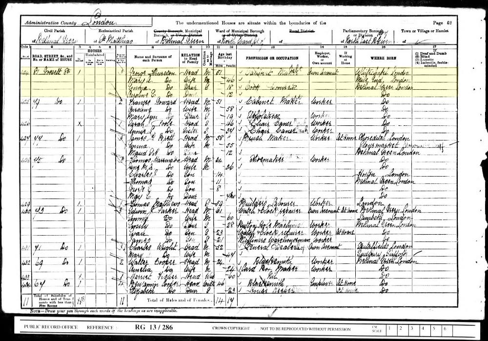 1901 England, Wales & Scotland census, 81 Gosset Street, Bethnal Green, London, RG13/286, Folio 163, Page 62, Schedule 424, head of household: George Thurston, National Archives.