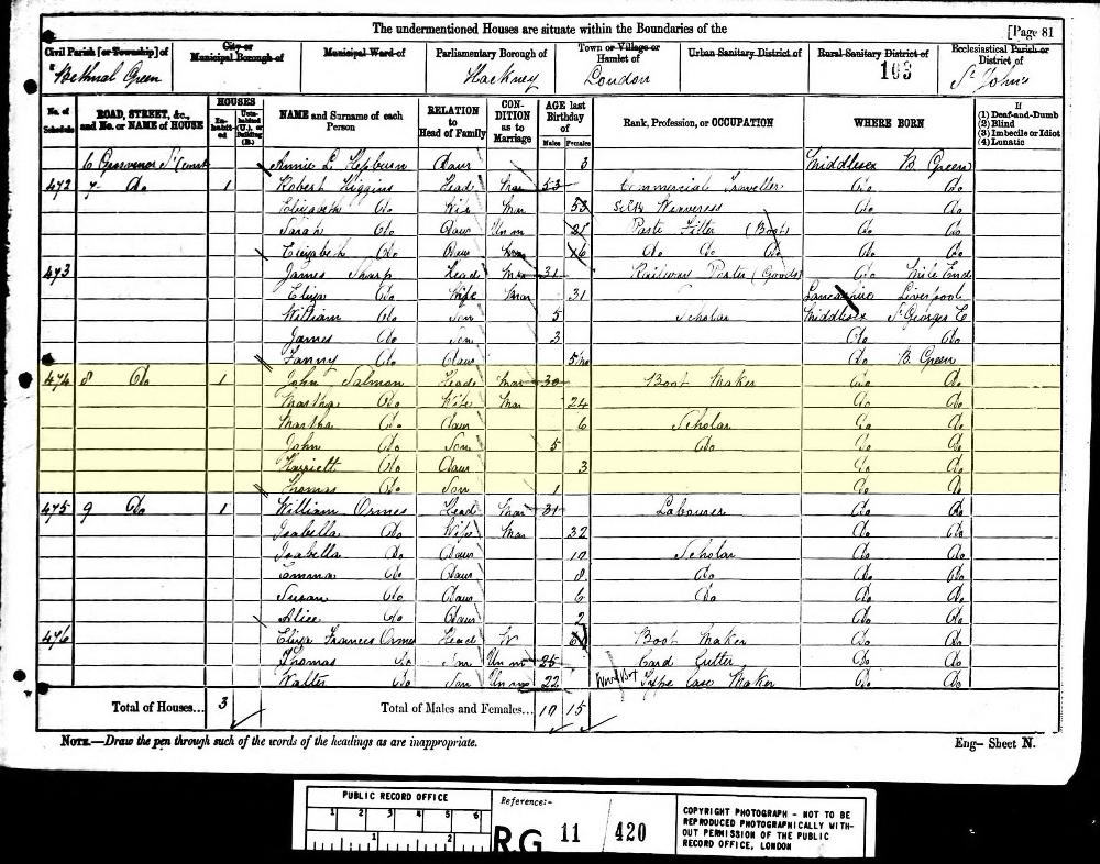 1881 England, Wales & Scotland census, 8 Grosvenor Street, Bethnal Green, Middlesex, RG11/420, Folio 103, Page 81, Schedule 474, head of household: John Salmon, National Archives.