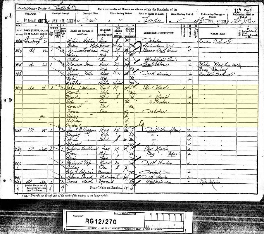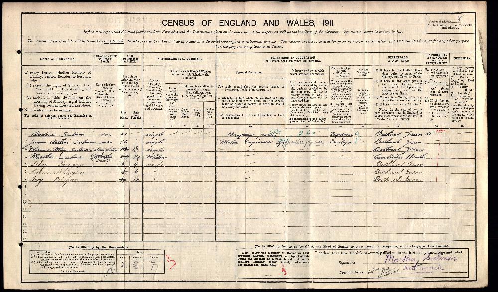 1891 England, Wales & Scotland census, 26 Ganber Street, Bethnal Green, Middlesex, head of household: John Salmon, National Archives.