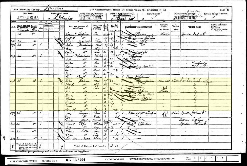 1901 England, Wales & Scotland census, 26 Ganber Street, Bethnal Green, London, RG13/294, Folio 105, Page 46, Schedule 298`, head of household: John Salmon, National Archives.