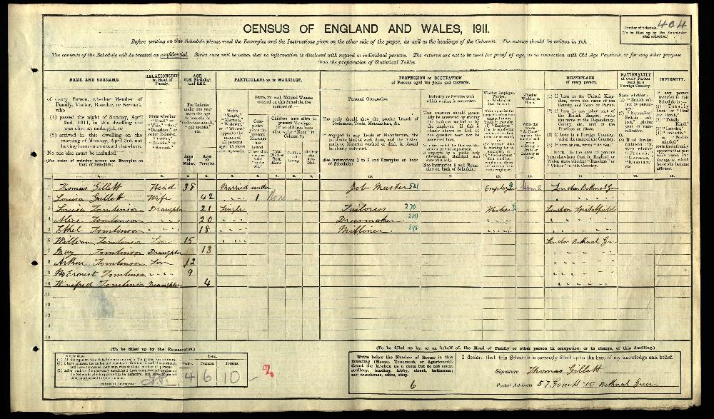1911 England, Wales & Scotland census, 57 Gibraltar Walk, Bethnal Green, London, RG14/1384, head of household: Thomas Gillett, National Archives.