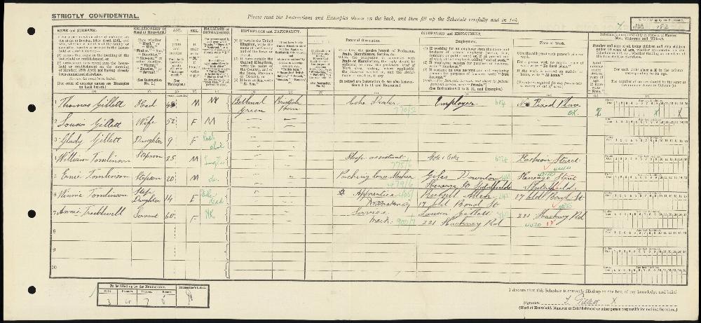 1921 England, Wales & Scotland census, 221 Hackney Road, Shoreditch, London, RG15/01377, Schedule 182, head of household: Thomas Gillett, National Archives.