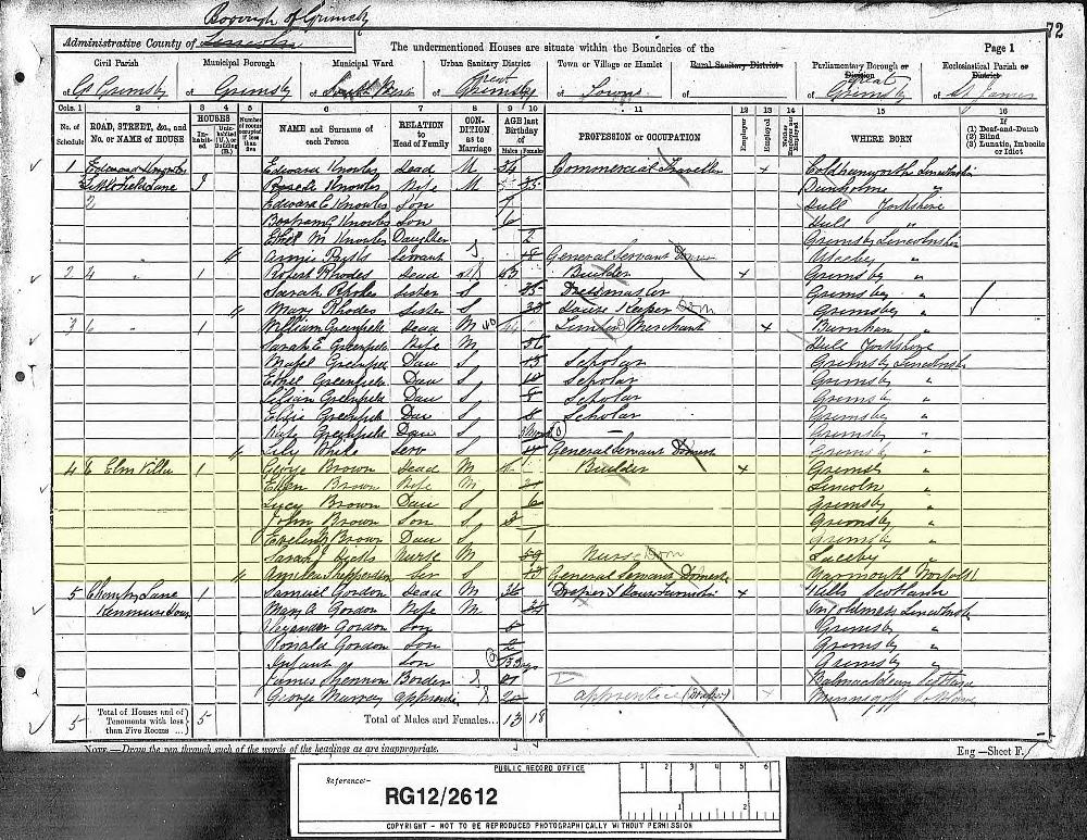 Ibid. George Brown working as a Contractor in Grimsby. National Archives. Call Number: RG10/3411.
