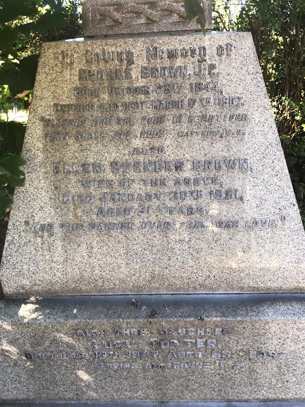 Memorial to George Brown and Ellen Spenser Brown, (Find a Grave website). Cit. Date: 20 March 1907.