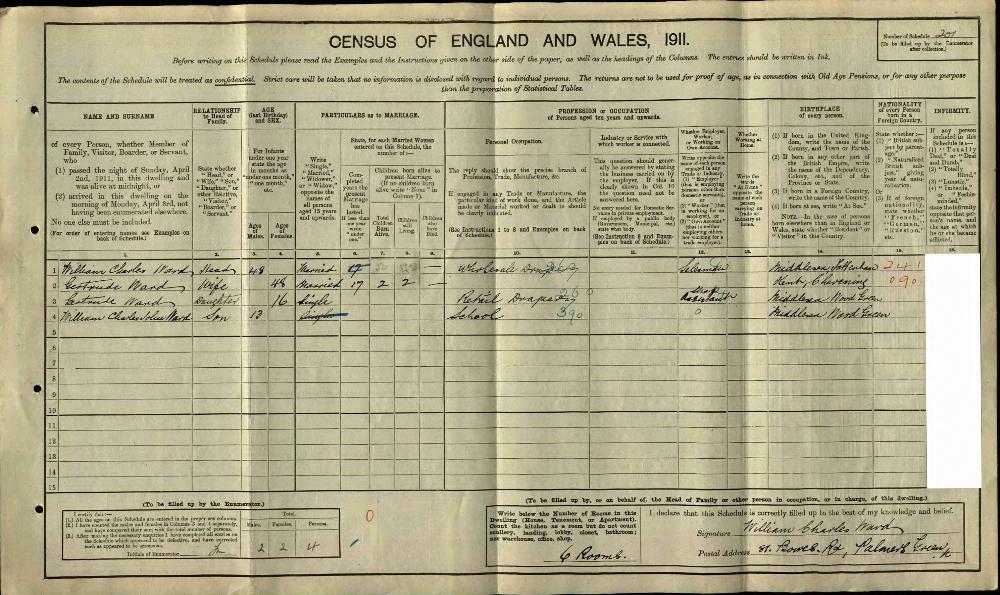 1911, 1911 Census for Household of William Charles Ward in Edmonton, Middlesex