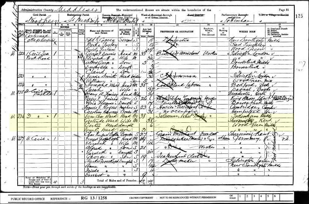 1901 United Kingdom census, 3 Cecil Terrace, Park Road, Tottenham, Middlesex, RG13/1258, Folio 125, Page 31, Schedule 226, head of household: Wm Chas Ward, National Archives.